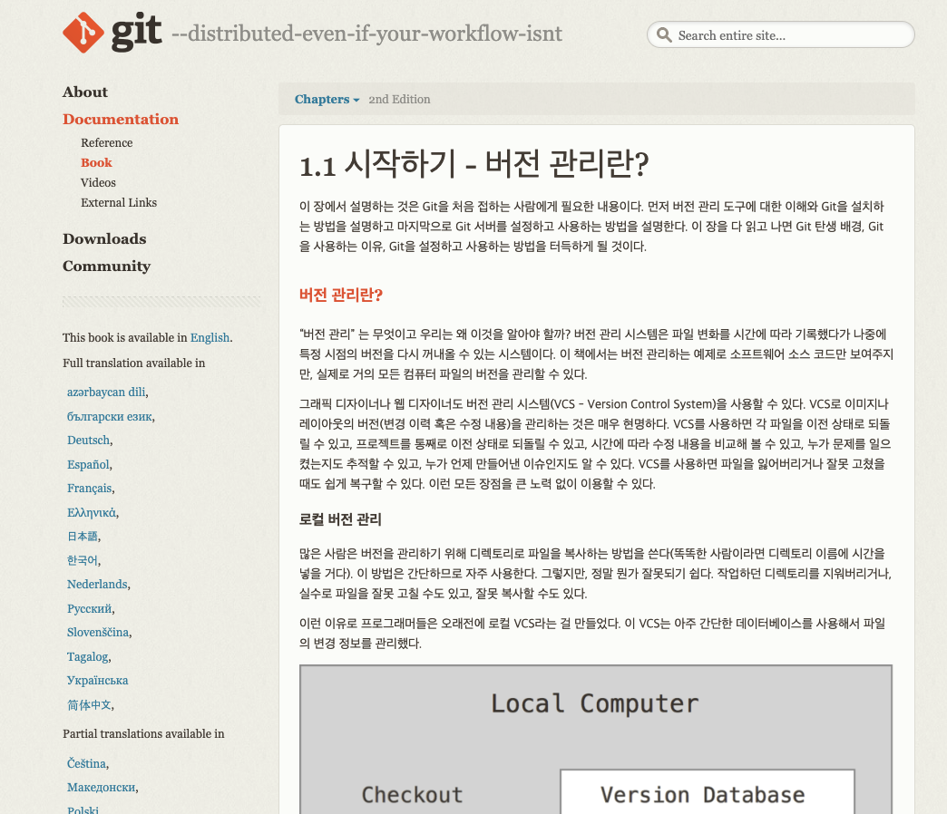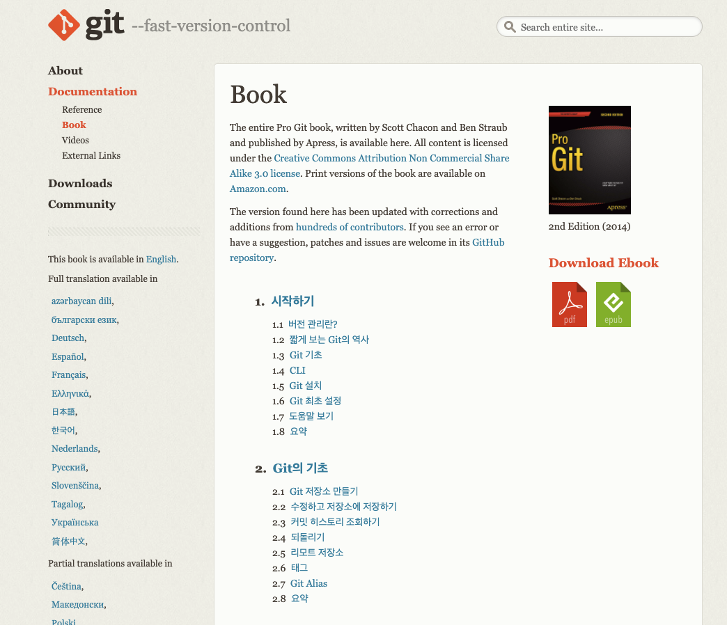 * Book - 한국어 (한국어판 - Pro Git) : 웹 사이트에서 읽을 수 있고, pdf 파일로 내려받아 읽기도 가능