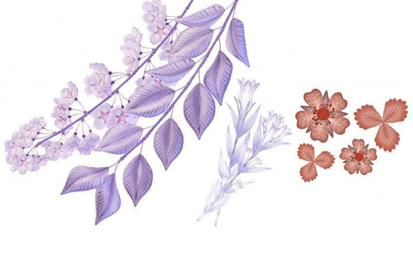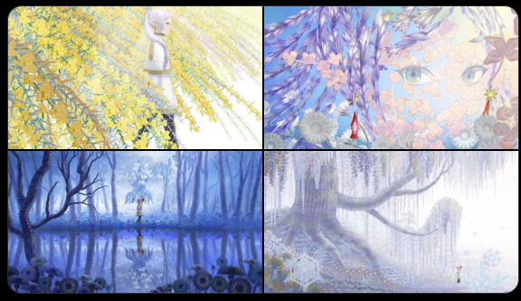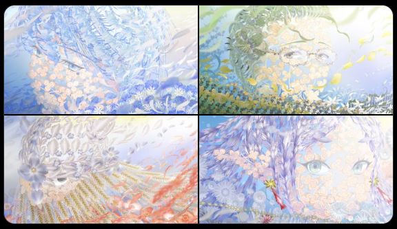 (실제 모티브 식물 : 참나리 / 용담 / 잉글리쉬 블루벨 / 보리 / 가지 늘어뜨린 벚꽃 (= 수양벚꽃?) / 뱀딸기, 딸기