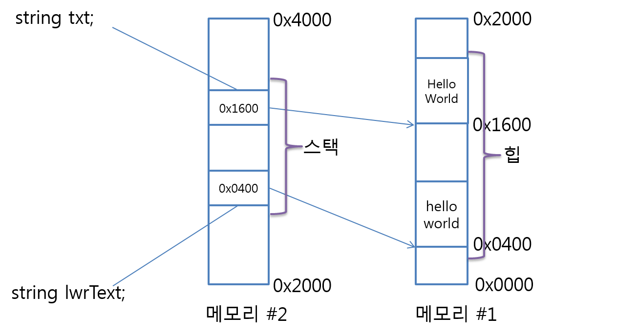 4) 다시 스택에 있는 txt 변수에 3번 과정에서 새롭게 할당된 힙의 주소를 저장