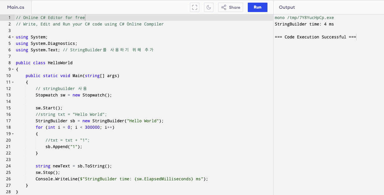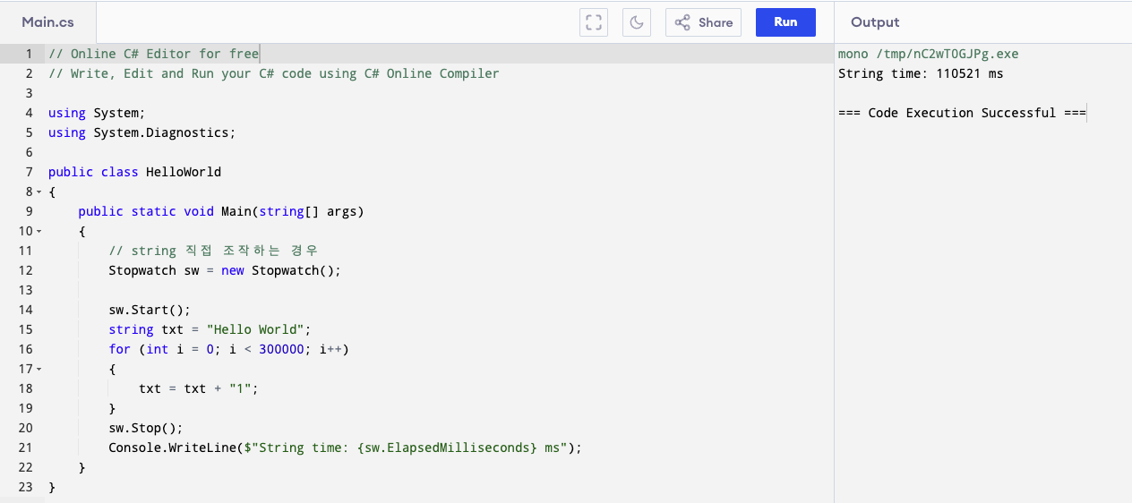 - 문제점 : string에 대한 모든 변환은 새로운 메모리 할당을 발생시킴. (System.String 클래스의 메서드를 사용할 때마다 메모리에 새 문자열 개체가 생성되는 것)