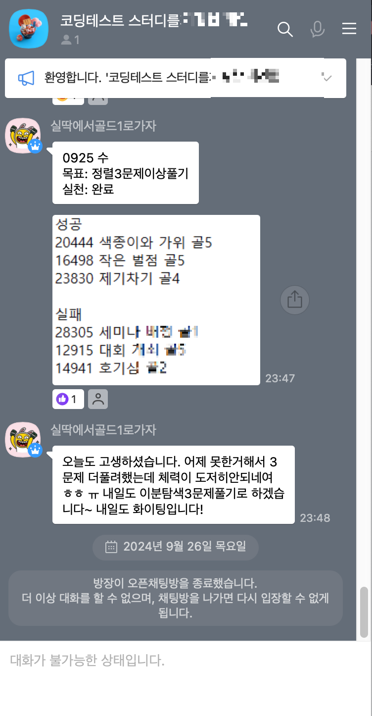 내 뜻은 아니지만, 한 달 넘게 스터디를 해오던 오픈채팅방이 폭파되어 버렸다.